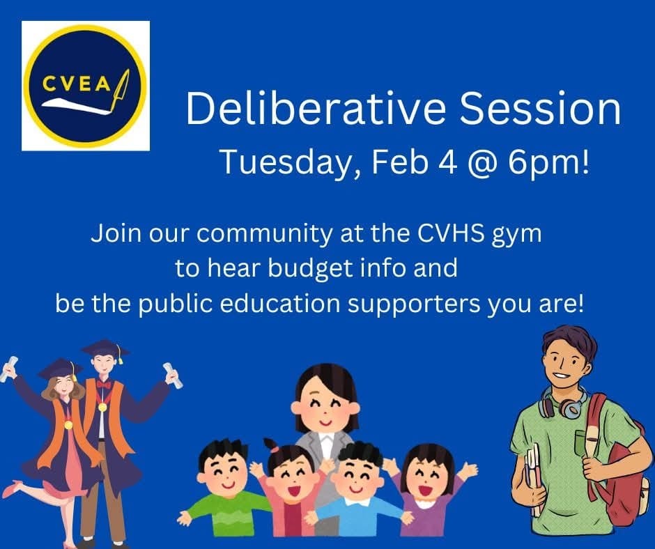 Deliberative Session is Tuesday, Feb 4 @ 6pm! Please join our community at the CVHS gym to hear (and weigh in if you are a voter) budget info and be the educational supporters you are!